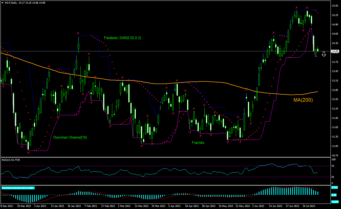 El análisis técnico del gráfico del precio de las acciones de Ford en el intervalo de tiempo diario muestra que #S-F,Daily retrocede hacia el promedio móvil de 200 días MA(200) después de alcanzar el máximo de 10 meses hace una semana. Creemos que el impulso bajista se reanudará después de que el precio rompa por debajo del límite inferior del canal Donchian en 13.92. Este nivel se puede utilizar como punto de entrada para colocar una orden pendiente de venta. El stop-loss se puede colocar por encima de 14,63. Después de activar la orden, el stop-loss se moverá todos los días al siguiente máximo fractal, siguiendo las señales del indicador parabólico. Por lo tanto, estamos cambiando la relación de pérdidas/ganancias esperadas al punto de equilibrio. Si el precio alcanza el nivel de stop-loss (14,63) sin llegar a la orden (13,92), recomendamos cancelar la orden: el mercado ha sufrido cambios internos que no se han tenido en cuenta.